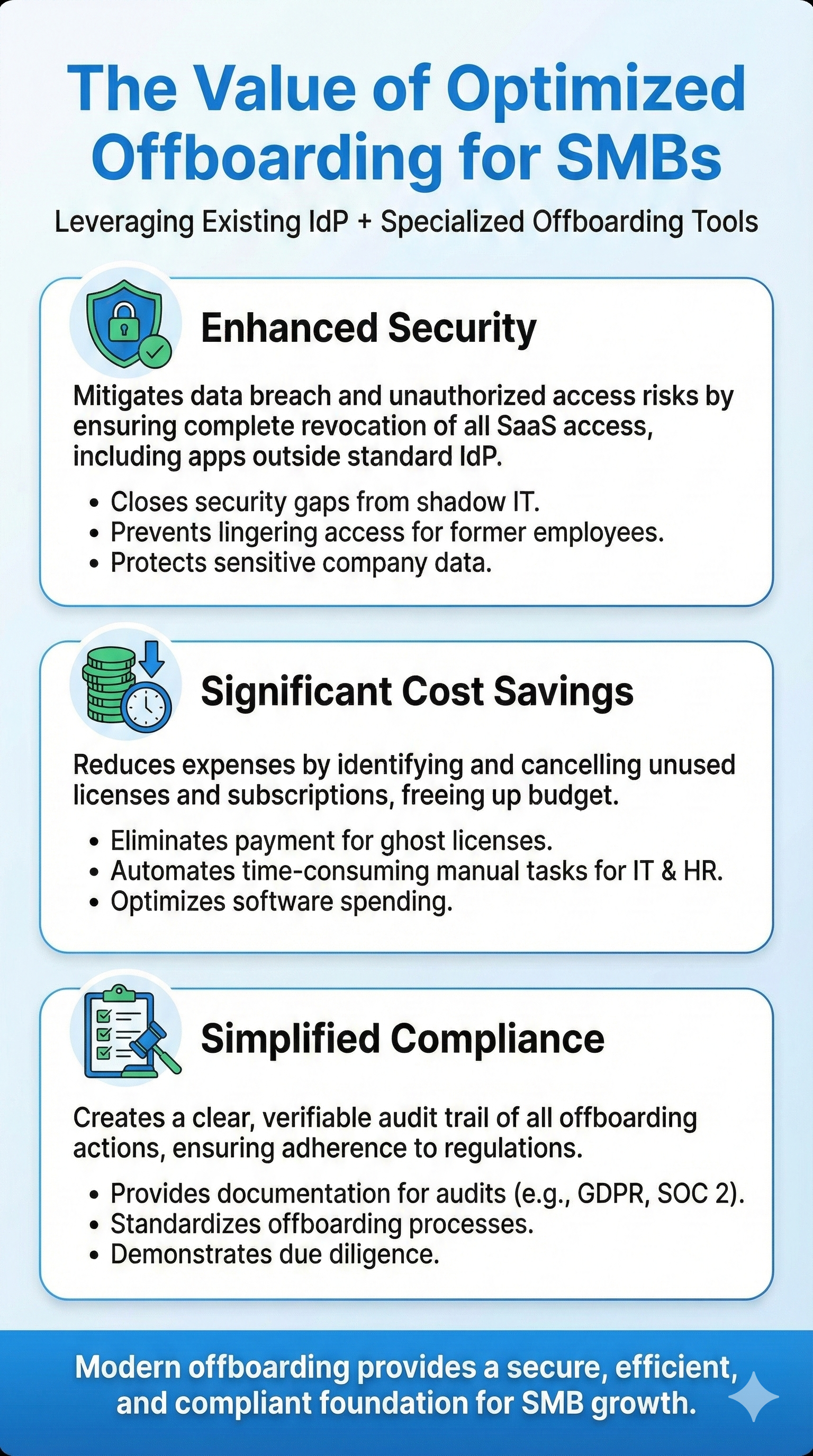 Offboarding is one of the most overlooked key processes in growing organizations — and one of the most significant security risks. Yet most small and medium-sized companies don’t have the budget or need for enterprise IAM tools. Here’s how SMBs can create a secure, scalable offboarding workflow using tools they already have.